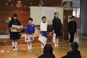 朝礼で、給食委員が「給食の時に気をつけること」について分かりやすく説明しました。給食を待つ時、準備の時、食べる時、片付ける時など、それぞれの場面で気をつけることを、写真付きの掲示物を使って説明をしました。今日の給食では、みんなで声を掛け合って、上手に活動するとができました。