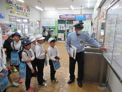 新見駅では、時刻表の見方や切符の買い方、列車ホームで気をつけること等を教えてもらいました。 新見駅はモバイルICOCAが利用可能ですが、刑部駅では利用できないので、子ども達は小人切符の買い方をよく聞いて、スムーズに購入することができました。