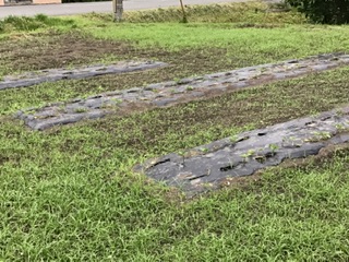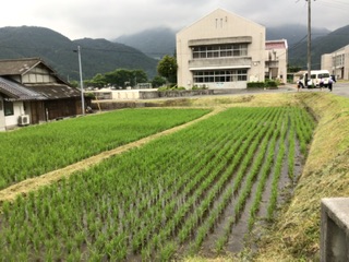 <1・2年生が植えたさつまいも> <水田の周りは、刑部振興協議会の森本さんに草刈りをしていただきました>