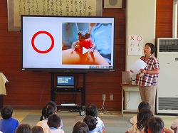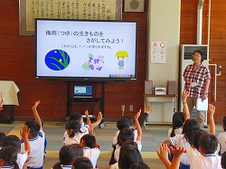6月といえば? 今月の児童朝礼では、山本先生に、クイズ方式で楽しく、6月の生き物と題して、「カエルとかたつむり」について教えてもらいました。