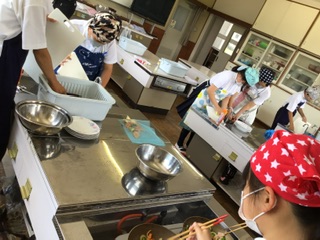 慣れた手つきで調理実習 野菜炒め 6年生 6年生になって初めての調理実習でしたが、5年生の時の経験と家でのお手伝いの経験から、手際よく進めていました。細く丁寧に切られた野菜が香辛料とうまく絡み合い、とても美味しい野菜炒めでした。