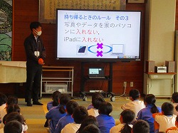 今年度もiPadの持ち帰り始めました 今年度もiPadを持ち帰り、家庭学習に使用しています。効果的な利用ができるように、情報教育担当の尾﨑先生が、子どもたちとルールを確認しました。