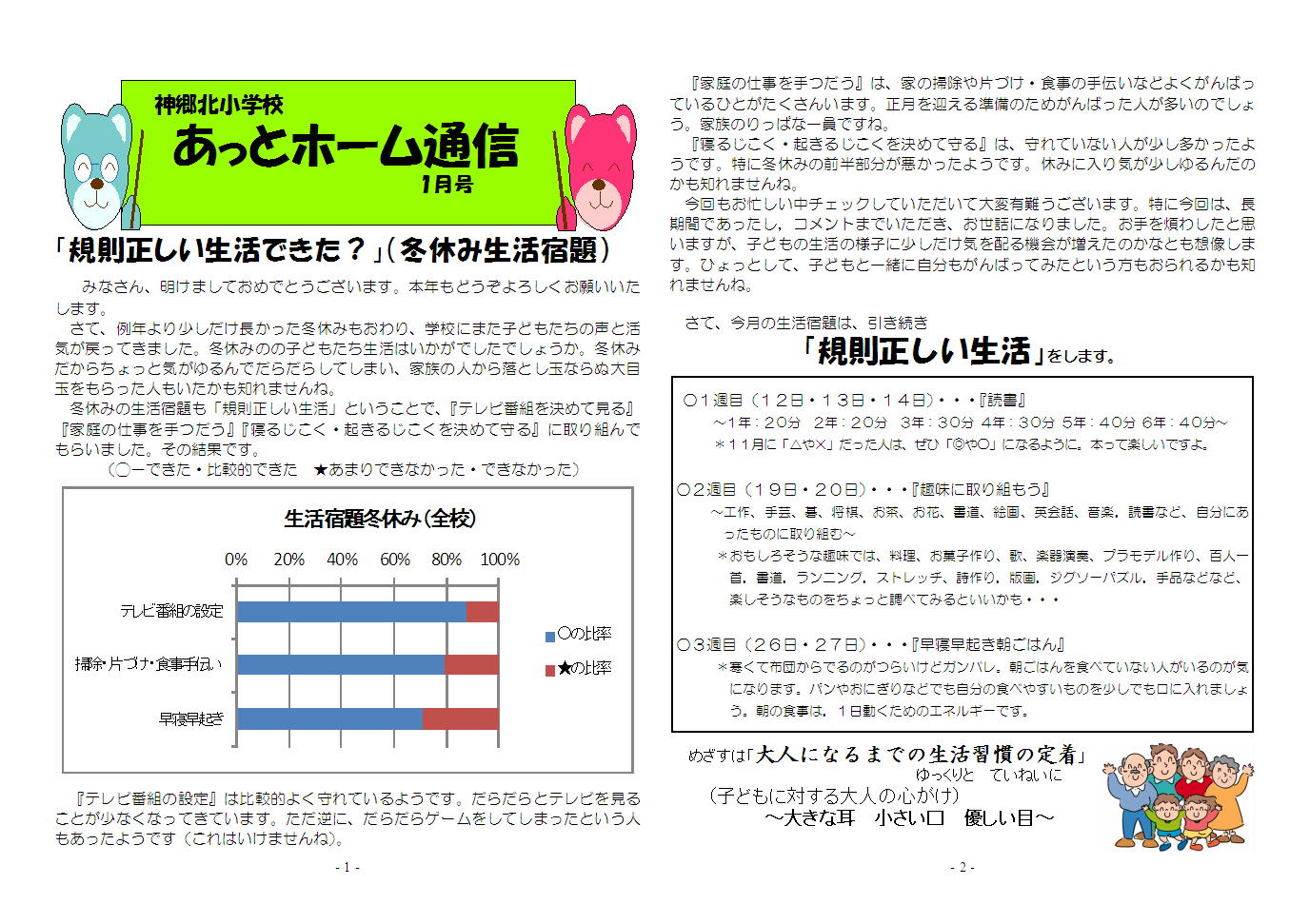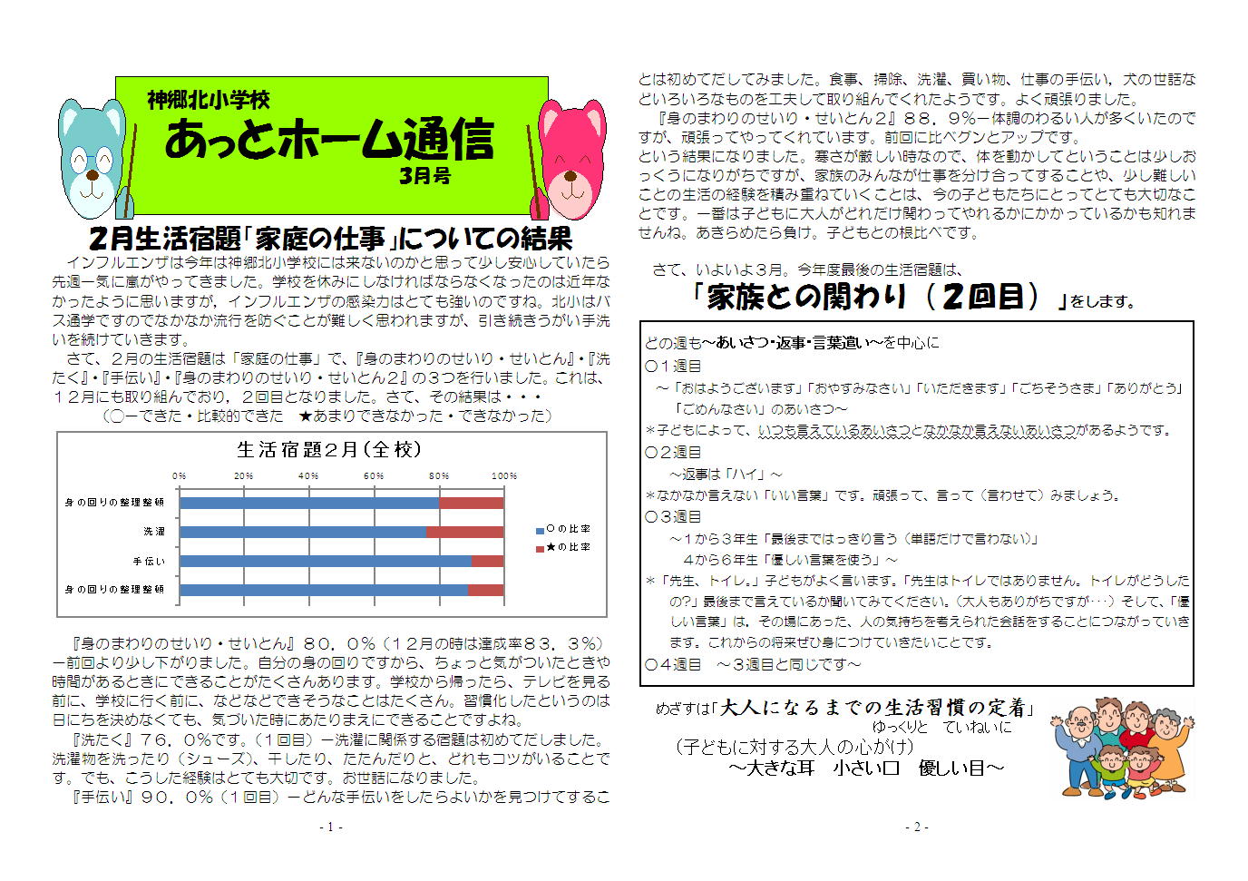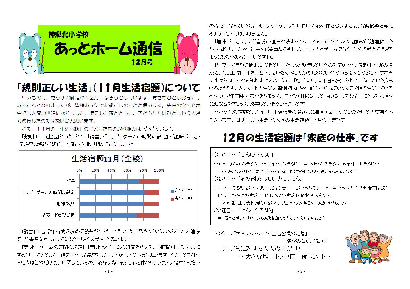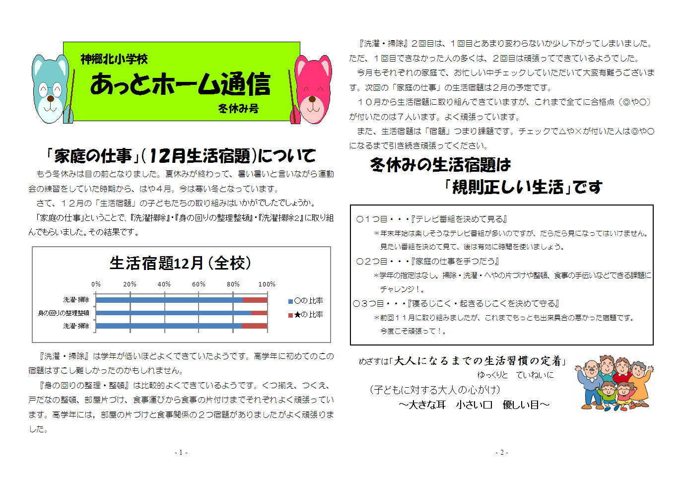 神郷北小学校では,子どもたちのきまりよい生活習慣の定着をめざし,今年度10月より「生活宿題」を始めました。 基本的な生活習慣を身につけるため,家庭での生活に関する宿題を学校からだし、子どもたちにやってもらうものです。これには、家庭の協力を得ながら、「大人になるまでの生活習慣の定着」をめざして、~ゆっくりと てていねいに~を合言葉に取り組んでいます。 子どもたちの取り組みの様子は「あっとホーム通信」でお知らせしています。