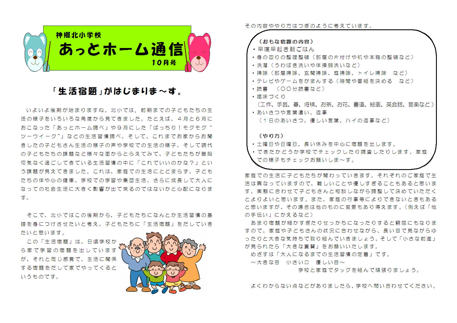 神郷北小学校では,子どもたちのきまりよい生活習慣の定着をめざし,今年度10月より「生活宿題」を始めました。 基本的な生活習慣を身につけるため,家庭での生活に関する宿題を学校からだし、子どもたちにやってもらうものです。これには、家庭の協力を得ながら、「大人になるまでの生活習慣の定着」をめざして、~ゆっくりと てていねいに~を合言葉に取り組んでいます。 子どもたちの取り組みの様子は「あっとホーム通信」でお知らせしています。