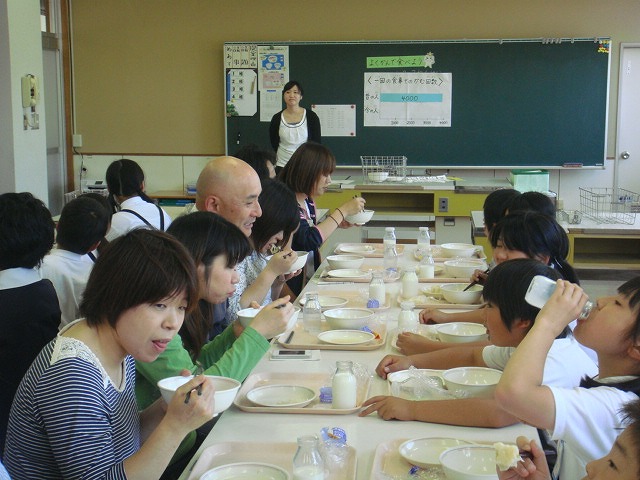 親子で楽しく学校給食をいただきました。学校栄養士の先生からよく噛んで食べる