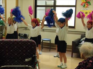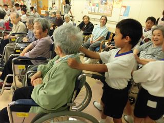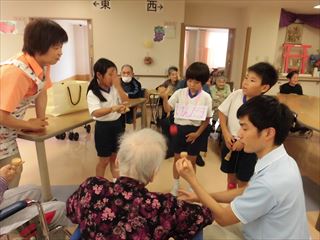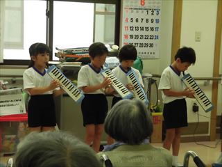 6月27日(火)1・2年生が学区にある「介護老人保健施設くろかみ」へ交流に伺いました。一生懸命練習した「茶つみ」の歌や「かっこう」のけん盤奏を披露しました。また、ダンスをしたり肩もみをしたり、けん玉やお手玉をしたりして交流ができました。「かわいいなあ。」と目を細めてみておられる様子と小さな手で一生懸命肩もみをする様子がほほえましかったです。