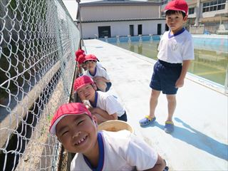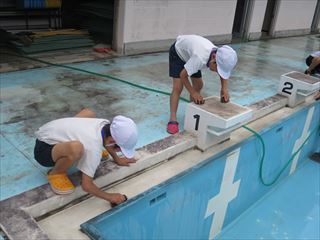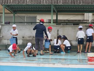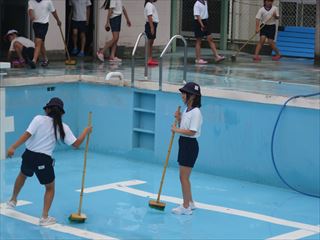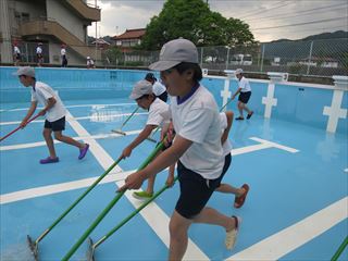 まず、1・2年生がプールの排水の溝掃除をしました。小さな手と小さなスコップでたまった土や枯れ草を上手に取りました。そして午後には3年生以上がプールの床や壁をきれいに掃除しました。6月9日から始まる水泳学習が楽しみです。
