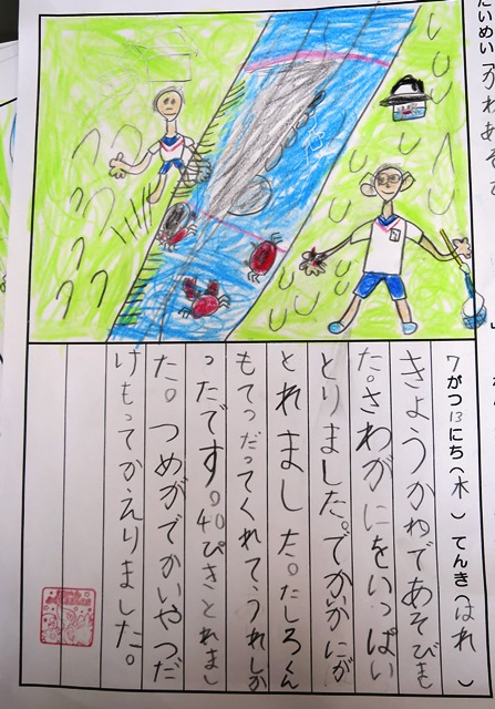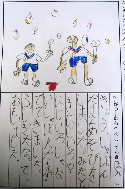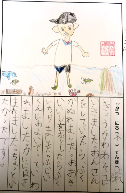 1年生が入学してから3ヶ月が経ちました。もうすぐ夏休みです。はじめは「あいうえお」や「自分の名前」を書く練習をしていた1年生。夏休み前に絵日記を書く勉強をしていましたが、その出来栄えの良さに驚きました。絵も字もとても上手で、豊かな表現力でかけるようになっています。1学期間の成長をとても感じます。夏休みの思い出もしっかりかいてくださいね。