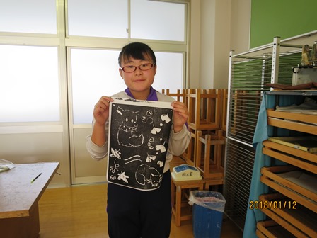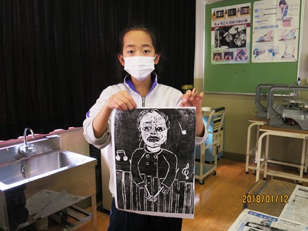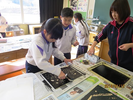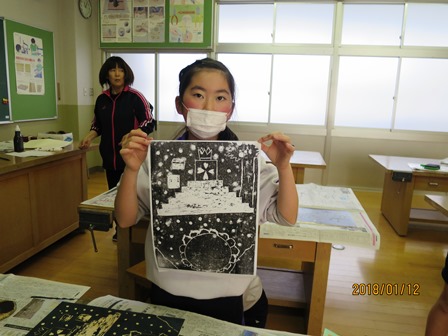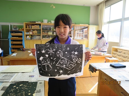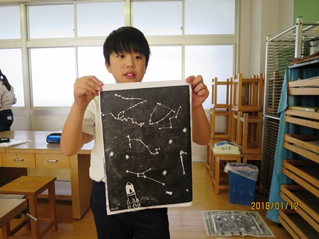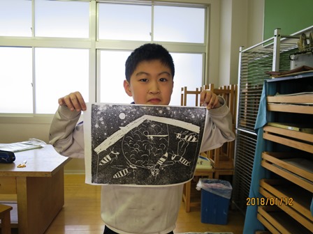 1月12日(金)4年生が版画を刷っていました。初めて彫刻刀を使ってほった木版画です。雪の結晶や北斗七星など思い思いの絵を描きていねいに彫っていました。おそるおそるインクをローラーでのばしてつけ、紙を置いてはがすときのワクワクとした表情が素敵でした。なかなかの仕上がりに満足そうな笑顔でした。