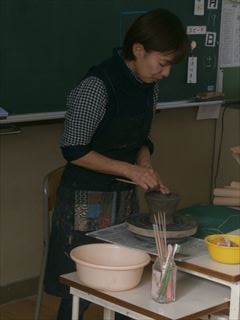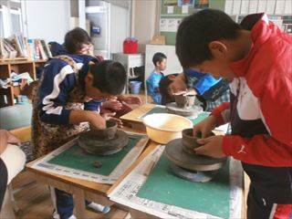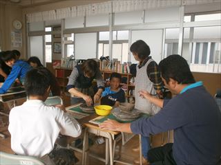 6年生と保護者の方で、抹茶茶碗を作りました。というのも来年の2月17日(金)に、6年生の卒業をお祝いするお茶会が公民館で行われます。その時に自分で作った抹茶茶碗を使用するためです。親子で作った茶碗でいただく抹茶は、美味しいにちがいありません。指導してくださった「吹屋ふるさと村陶芸村」の田邊 典子さんも誉めてくださるほど、作る手に力がこもりました。出来上がった作品はどれも個性あふれるものでした。余った土で箸置きを作った方もいました。