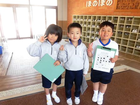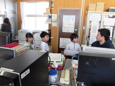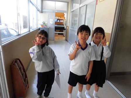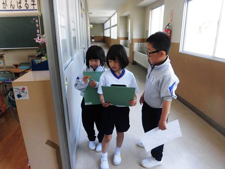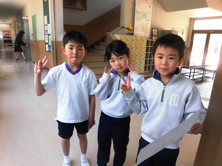 4月18日(水)今日は2年生が1年生を連れて学校探検をしていました。7人の2年生に14人の1年生なので、1人が2人を連れて歩いていました。2年生がずいぶんと上級生らしく教えてあげる様子に感心しました。