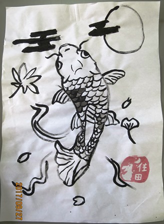 10月11日は学区の国司神社で子どもたちが楽しみにしている高尾祭が行われます。そのお祭りに飾る灯籠に子どもたちがかいた絵を例年はっています。今年は6年生が学習した水墨画を灯籠にもかいてみました。楽しい絵がかけました。