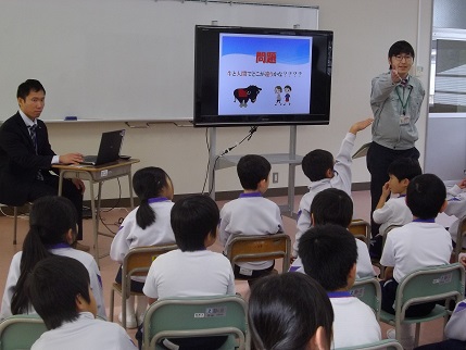 11月30日(木)に、全校児童対象の「牛の事前説明会」を実施しました。備中県民局の田中さんに牛の説明をしていただきました。「人と牛の違いは?」等のクイズを入れながら、牛の種類・農家について・和牛の一生、そして、牛の世話について等、詳しくお話をしていただきました。12月4日から8日までの5日間、高尾小学校に子牛がやってきます。今日の説明を参考に、大切にお世話したいと思います。