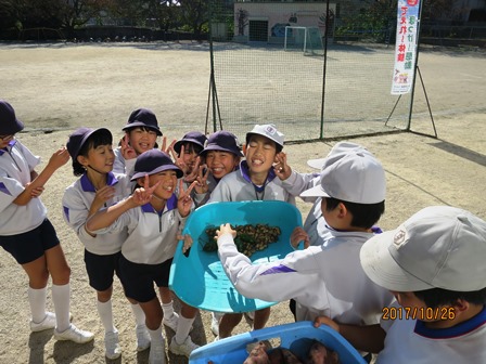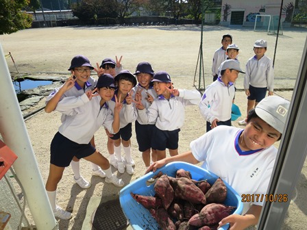 5年生が芋掘りをしました。美味しそうな大きい芋がたくさん収穫できました。落花生もできていて、ちゃんと落花生の形になっていることに喜んでいました。どんなお料理をしようか、楽しそうに話していました。
