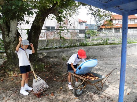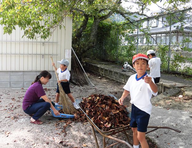 9月19日(火)先日の台風で桜の木の葉がたくさん落ちていました。その量にうんざりしながら掃いていると、業間になって子どもたちが出てきました。見ていた子どもたちが「先生手伝いたい。」と言うので、「遊んでもいいんだよ。」と答えると、「ううん。お家でもお手伝いするの、大好きなんだ。」といって上手にほうきで掃いてくれました。落ち葉掃きがずいぶん楽しくなりました。