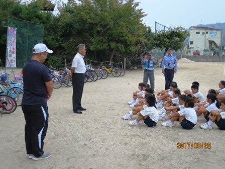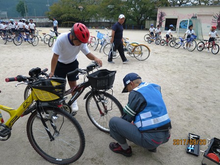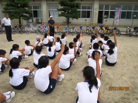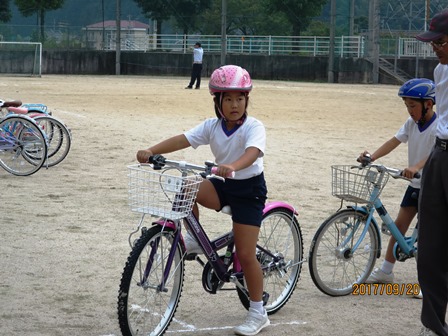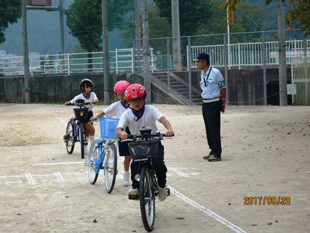9月7日に雨で出来なかった交通教室を本日9月20日に行いました。新見警察署より3名の方が来られて、自転車の点検方法や道路での乗り方を教えてくださいました。なので、細い道やS字のコースは難しそうでしたが、左側から乗り降りすること・発進や停車の時は後方確認をすることを実際に運転しながら学習しました。明日から交通安全週間、学習したことを忘れず、これからも安全に気をつけて生活していきます。