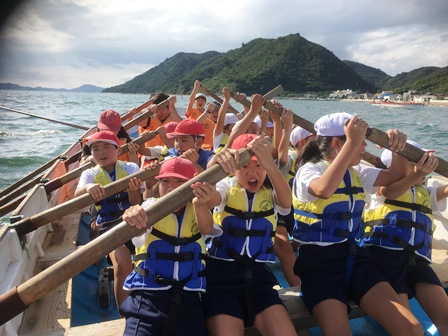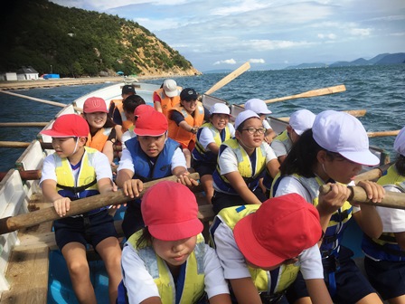 海事研修の5年生の様子です。お天気もよくなり、カッター訓練に臨んだ子どもたち。重いオールをみんなで力を合わせてこぎました。大きな口を開けて「ヨーイショ!」