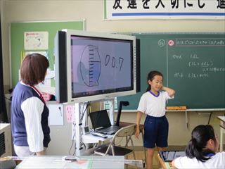 4年生の小数の学習で、導入や問題解決の手立てなどとしてipadを効果的に活用しました。先生から図が自分のipadに送られると、考えを書き込んで先生に送り返し、全体で共有することができます。参観された先生方はipadの教育効果の高さに感心していました。
