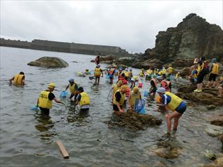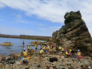 翌日の午前中は「磯観察」を行いました。子どもたちの楽しみにしていた活動の一つでした。水着に着替えバスに乗り、日本海側の海岸に着きました。そこで海岸にいる生き物を探し、話を聞きました。ウニが捕れたりなまこが肛門から内蔵を出す様子を見たりと、初めての経験をしました。あっという間に時間が過ぎました。宿泊所に戻り、昼食を摂り、帰りました。帰りのバスでは、ほとんどの子どもたちが寝て過ごしました。