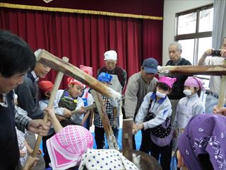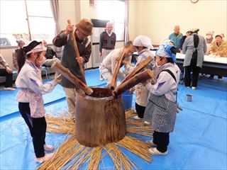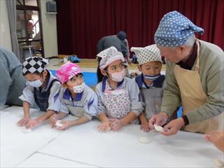 12月9日、公民館事業のもちつき大会に1・2年生が参加しました。大人でもあまり経験のない杵と臼でつく餅つきができるとあって、1・2年生はこの日を楽しみにしてました。公民館で、長寿クラブの方々を中心に、杵の持ち方・つき方、餅のもみ方を教えていただきました。子どもたちは興味津々、順番を待つ間も身を乗り出して友達の様子を見ていました。そして餅をもむのも、とても楽しい活動でした。形が少々不揃いでも、とても美味しいきなこ餅とあんこ餅になりました。