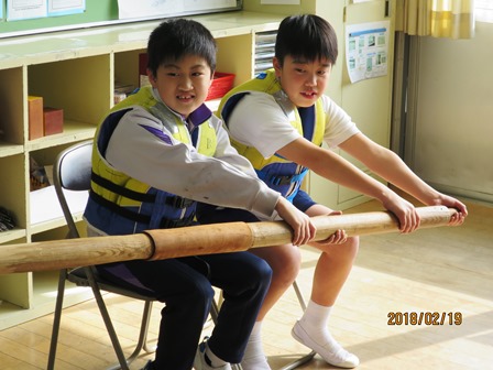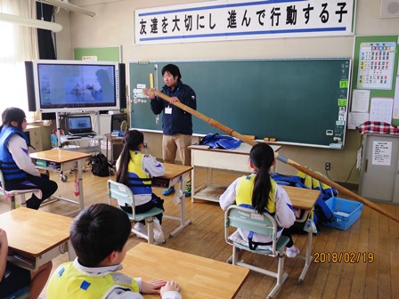 2月19日(月)来年海事研修に行く4年生のために渋川青年の家の先生が授業に来てくださいました。渋川青年の家の活動やカッターの櫂の使い方などを教えていただきました。来年行くのがますます楽しみになりました。
