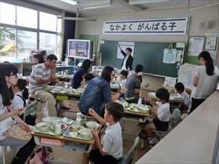 6月30日、1年生の親子給食、全校の授業参観、学級懇談、救急法講習会が行われました。家の方と給食を一緒に食べるとあって、1年生は準備前からそわそわうきうき、でした。家族の方が来られると「来たぁ。」と、満面の笑がほほえましかったです。家の方の「どんな様子で食べているんだろう」といった心配は無用のようでした。しっかりと食べることができました。橋の持ち方を栄養士から指導をうけたこともあり、今後の食事に生かしてほしいです。