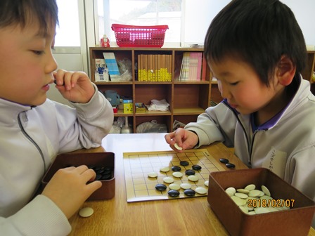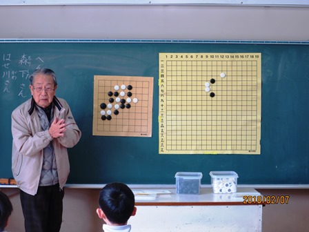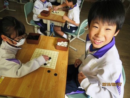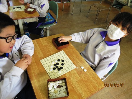 2月7日(水)今日は1・2年生が3名の先生方に囲碁を教えていただきました。はじめての1年生も教えていただきながら少しずつルールを覚えていきました。