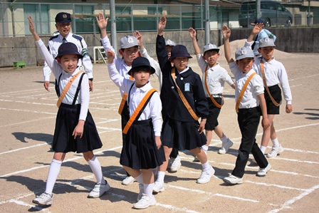 はじめに全体で横断の仕方を学習し、低学年は歩行、高学年は自転車の乗り方を中心に学習しました。