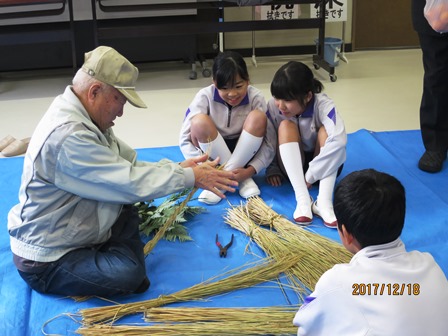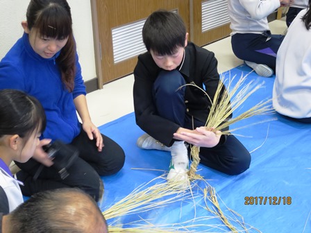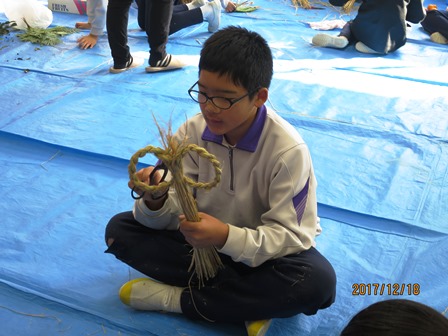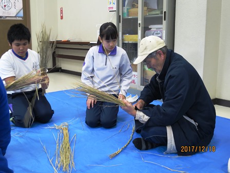 12月18日(月)今日は、5・6年生が公民館へ行ってしめ縄飾りを作りました。長寿会の方々に教わりながら一人一つつくりあげようと頑張りました。初めての5年生も何度もやり直しながら上手に作りました。中には家で作ったことがあるという子もいて、上手な手つきを披露する子もいました。準備や指導をしてくださった長寿会・公民館の方々、ありがとうございました。