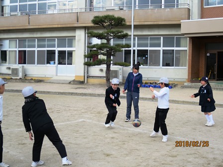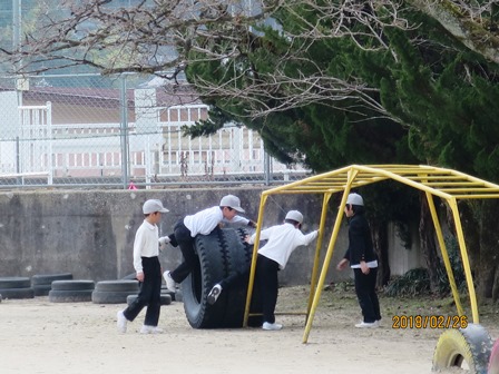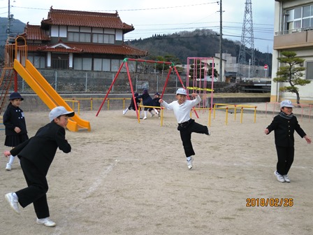 2月26日(月)今週の目標は「自分で作ろう元気な体」です。今日は日差しが春らしくみんな元気に外遊びをしました。2年生は学級遊びでドッジボールをしていました。先生も一緒になって仲良く遊ぶ様子がとてもいいです。3年生は大きなタイヤに乗って転がして遊んでいました。あとは竹馬や一輪車、サッカーやおにごっこ、ブランコ・・・。みんな元気に外遊びできる陽光の一日でした。