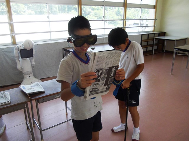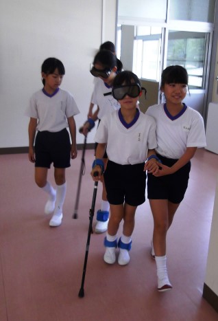 その後、高齢者の疑似体験をしました。動きにくさや見えにくさから、高齢者の気持ちを実感したようです。