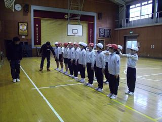 最初の写真は、どこの学校のものでしょう?答えは、新見第一中学校です。6年生が中学校の授業を体験する「出前授業」を、5年生と一緒に受けました。今年は「体育」でした。はじめに中学校の運動会の「集団行動」のビデオを観ました。3年生男子の一糸乱れぬ迫力ある様子に子どもたちは見入っていました。次に最初の写真にあるように授業の決まりや目標の説明を聞き、その後体育館で実際に「集団行動」の授業を受けました。「集合→2列横隊」「休め、気を付け」「立つ、座る、聞く姿勢」など基本中の基本を何度も繰り返しました。子どもたちの思っていた授業内容とは違ったかもしれませんが、中学校に入ると学習する内容ですし、基本を身に付けている生徒だからこそ素晴らしい集団行動を披露できたのです。授業を受けている5・6年生の顔は真剣そのもので、最後まで集中していました。