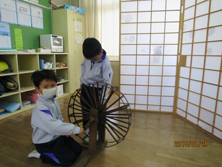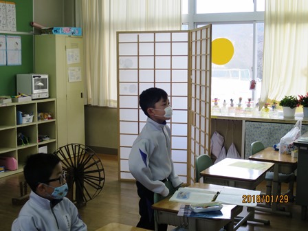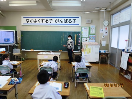 1月29日(月)1年生が教室で国語「たぬきの糸車」の学習をしていました。「いつものたぬきが」の言葉の意味を先生が問うと、「いつも来ていたたぬき」「いつもおかみさんのまねをしていたたぬき」と考えることができました。そして、糸車を回す真似ややぶれ障子からのぞく様子をして見せてくれました。楽しく可愛らしい学習の様子でした。