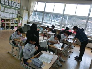 12月14日、新見高校3年生2名が3年生にそろばんを教えてくれました。教科書にも玉のはじき方や計算の仕方が載っているのですが、実際にそろばんを扱うときは、そばで教えてくれる人がいると助かります。地域のボランティアの方とは話をすることもできる3年生ですが、高校生は初めてです。嬉しさと緊張感のある授業でした。