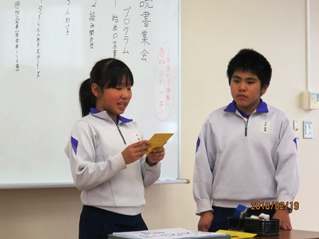 2月19日(月)今日の読書集会のために図書委員会は毎日のように休み時間や放課後に準備を進めてきました。今日の読書集会では「本の読み聞かせ」「ペープサート」「本の題名クイズ」などのプログラムで、全校で読書について考え、関心を高めようと計画をしました。集会後には「今日紹介された本を読んでみたい」「読み聞かせが楽しかった」との感想がありました。