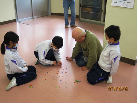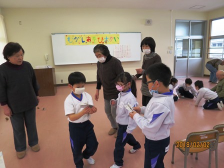 2月2日(金)1年生が昔あそび交流会をしました。長寿会の方7名が来てくださって、1年生とおはじきや紙飛行機、お手玉などの昔あそびをして交流しました。お手玉などは熟練の技も見せていただき、子どもたちも驚いていました。また、長寿会の方が持ってきてくださった紙飛行機に夢中になって遊びました。とてもとても楽しいひと時でした。