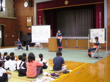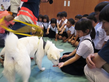 6月7日(木)今日は高尾小学校PTA研修部主催の教育講演会が行われました。演題は「人とともに生きるワンコ達」です。本日お招きしたのは、NPO財団法人ピースウインズジャパンの大西さん、仁尾さん、高橋さんと災害救助犬のルークくん、血糖値の低下を知らせる訓練を受けているアニモくんです。はじめに、殺処分される寸前からこの団体に保護され、人間のために活躍する犬となるために訓練をし、災害救助犬となった夢乃丞くんの紙芝居を聞かせていただきました。人間の身勝手さから人間不信になっていた夢之丞くんが人間のために活躍する災害救助犬となったお話にみんな感動しました。