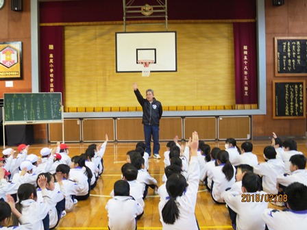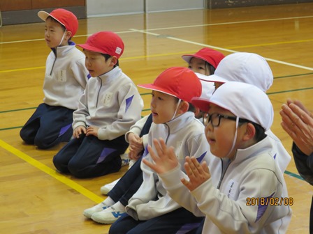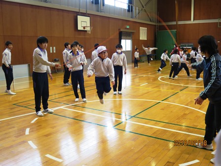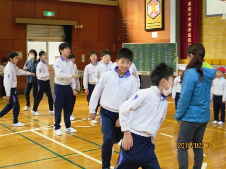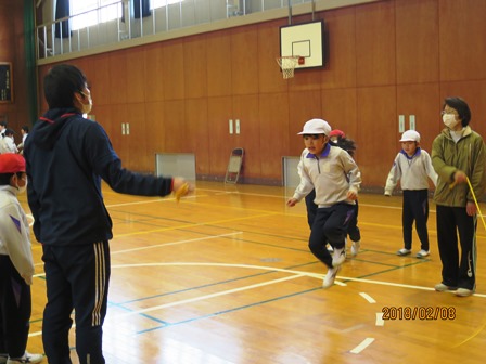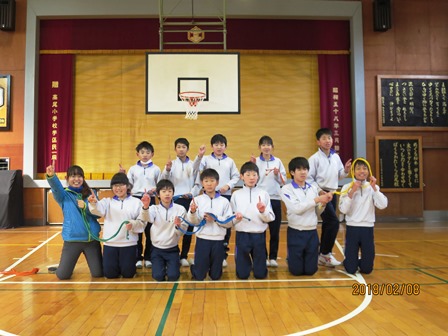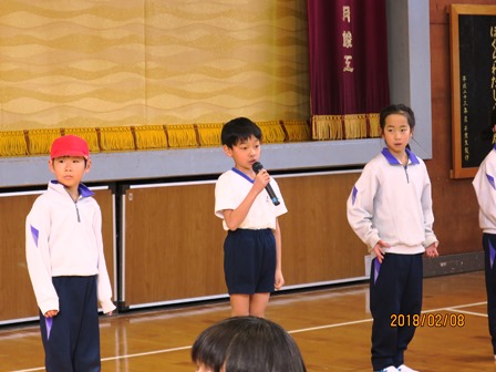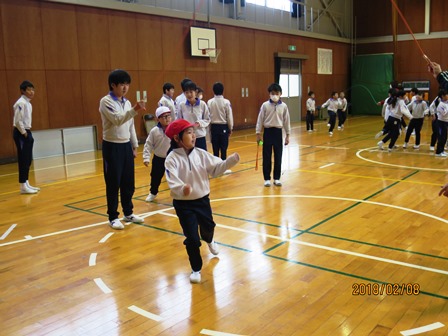2月8日(木)今日は健康環境委員会が計画をした長縄大会でした。今日のために各学年とも縄跳びの練習を続けてきました。玄関のところに貼ってある自分たちの記録を更新するたびに嬉しそうにしていました。八の字跳びと全員跳びをそれぞれ3分間跳んで記録を競います。さすがに6年生の記録がトップでしたがどの学年も表彰してもらい満足そうでした。学年代表から、「新記録が出て嬉しかった。来年も頑張りたい。」と言う感想がありました。