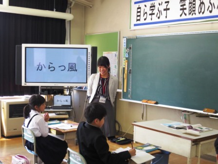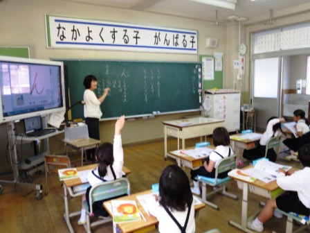 1年生は国語「ひらがな」でしっかり手を上げて発表する様子が見られました。