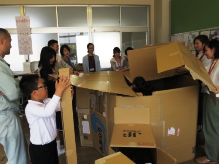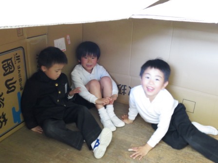 2年生は図工「ひみつきちをつくろう」です。どんな基地にするかを話し合って、楽しそうに作りました。
