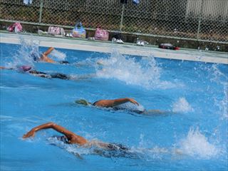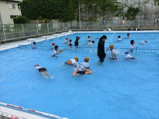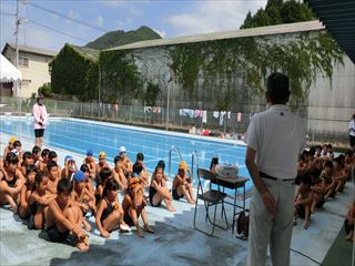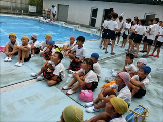 8月26日の3・4校時に、全校で「プール納め」を行いました。前半に子どもたちの泳いだ距離やタイムを測り、後半は着衣泳を行いました。夏休みにププールがあったとはいえ、本格的に泳ぐのは久しぶりでした。始めに学年代表が1名が今年のプールで頑張ったことを発表しました。その後、1年生は主に補助プールで、2年生からは本プールで自分の技量にあった種目で泳ぎました。苦しくても頑張る姿には多くの声援がありました。なかには記録が伸びた子どももおり、友達から驚きの声があがっていました。その後の着衣泳では、体操服やシューズを履いて泳ぎにくさを感じたりペットボトルをもって泳ぐことで浮くことを感じ取ったりしました。