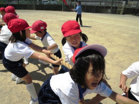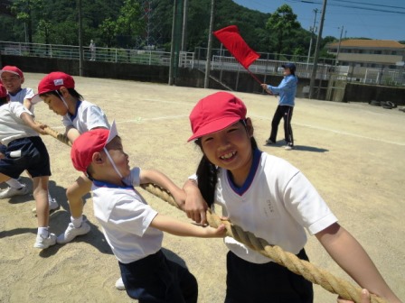 5月21日(月)今週も運動会の練習を頑張っています。今日は綱引き。赤も白も一生懸命つなを引いて力くらべをしました。今日の綱引きは赤が勝ちました。その前は白が勝ちました。本番が楽しみです。
