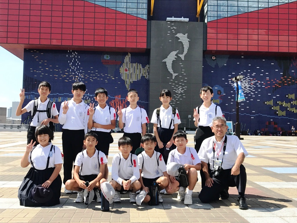 海遊館に到着しました!すぐ頭上を飛行機が飛び、高いビルが立ち並ぶ都会の町並みにバスの中からテンションがあがりましたみんなではいチーズ!