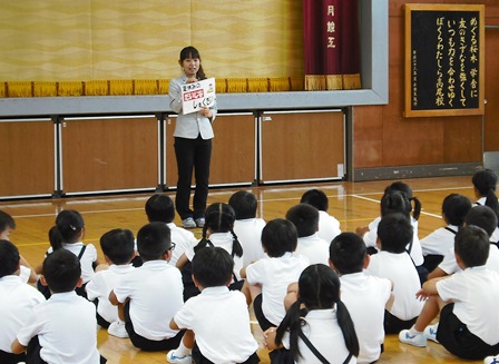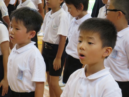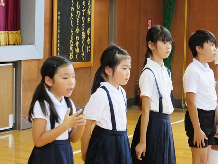 1つ目「今日までの授業日数は72日。そのうち全校児童が元気に登校したのは52日もあって嬉しい。」2つ目「あゆみの△は頑張る印。そこを頑張ればほかも伸びる。」3つ目「この夏休みに頑張ることを決めていると思う。『自分を磨く夏』にしてください。」とのお話がありました。真剣な表情で聞く子どもたちの姿に感動しました。各学年代表児童の「1学期の思い出」の中にもできるようになって嬉しかったことや楽しかった思い出がたくさん発表されました。生徒指導の先生から「元気な体と信用」を夏休み中も守り続けることを聞きました。