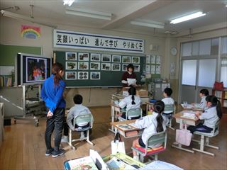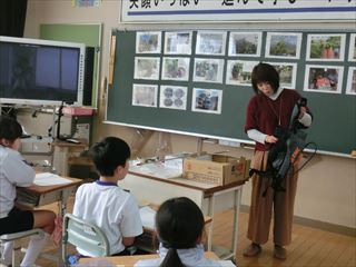 12月13日、3年生が社会科の学習で豊永のぶどう農家の方をお招きし、ピオーネを始めとしたぶどうについての話を聞きました。スーパーマーケットに並んでいるぶどうはよく見かけますが、育て方や管理の仕方、販売について学習するのは初めてです。時期が遅いので実際のぶどうはありませんでしたが、写真で確かめたり使用している機械を実際に見たりさせていただきました。学習すると知らないことが多く、ますます質問が増えました。おいしいぶどうの陰には、作り手の努力や苦労があることを知った3年生でした。