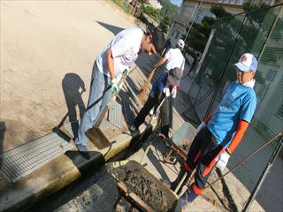 奉仕作業では「体育館の窓拭き・ギャラリーの掃除」「校舎内の窓拭き」「校舎溝の泥上げ」でした。この日も朝から暑く、汗だくだくになりながら作業していただきました。