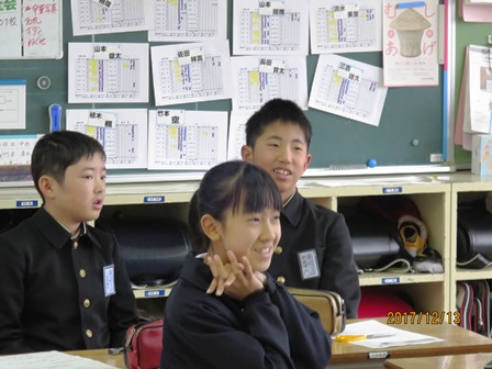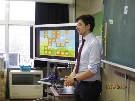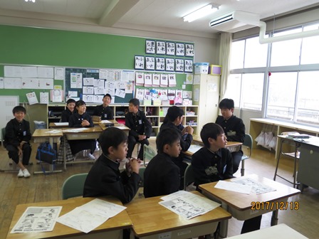 12月13日、6年生教室ではジョニー先生と6年生が英語の学習をしていました。マリオクイズゲーム」で2学期までの学習の復習をしていました。ジョニー先生の考えた問題文に英語で答えたり英語を日本語に直したりしてポイントを競うゲームです。もうすぐ中学生になる6年生。英語を好きになってどんどん使って欲しいです。