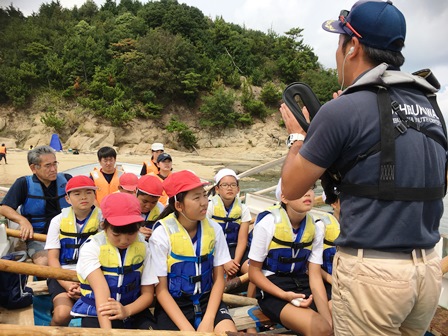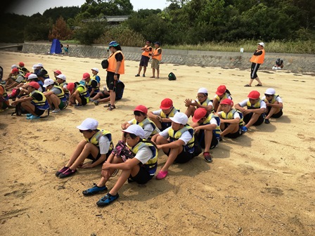 竪場島に到着しました。5年生の力だけで漕ぎきりました。すばらしい!ちょっと疲れたかな?今から昼食(お弁当)です。