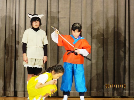 11月13日(月)今日から音響・照明をセットして、舞台での練習が始まりました。どの学年もセリフ覚えや舞台での動きの練習に余念がありません。4年生は「桃太郎は鬼を成敗しなかった」という劇をします。普通の桃太郎のお話とは違い、おもしろそうです。他の学年の劇も楽しく明るい劇が多いようです。本番は25日(土)。皆さんに観ていただくことを楽しみに練習を頑張っています。