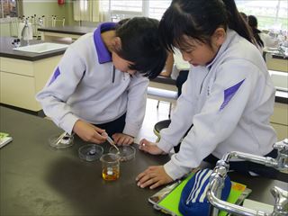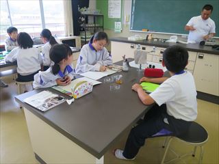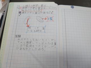 理科室で5年生が楽しそうに実験をしていました。パン・ご飯粒・インゲンの種にヨウ素液をかけて色の変化を調べる実験です。子どもたちはじっと目の前で起こる変化を見つめています。そして、青紫色に変わって、デンプンがあることを確信した表情。ノートにも実験したことをきちんと書いていました。主体的な学びができていますね。